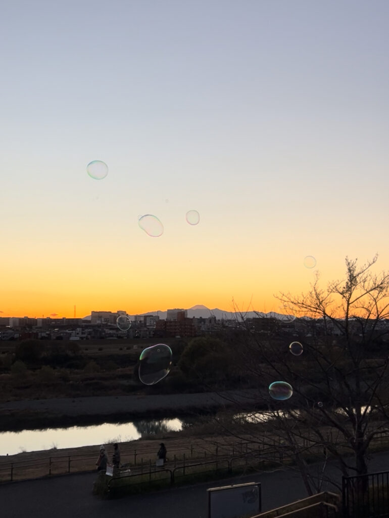 運が良いとシャボン玉が飛んでいて、夕陽✖️シャボン玉のキラキラした景色が見れるので
